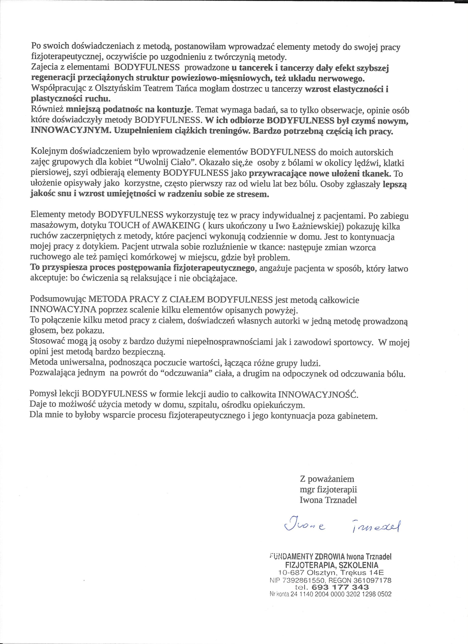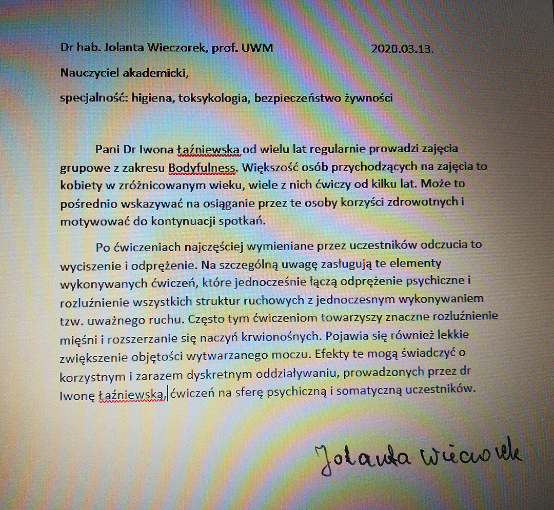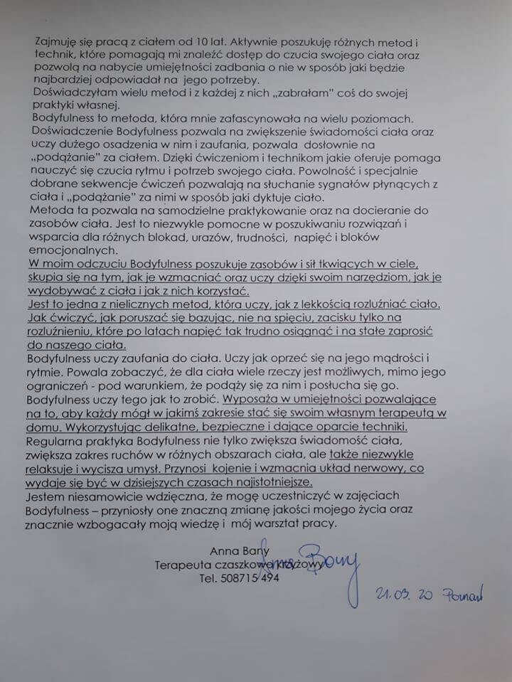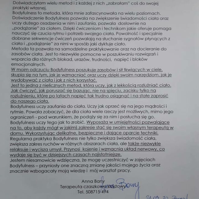 Opinia w sprawie zajęć terapeutycznych BODYFULNESS