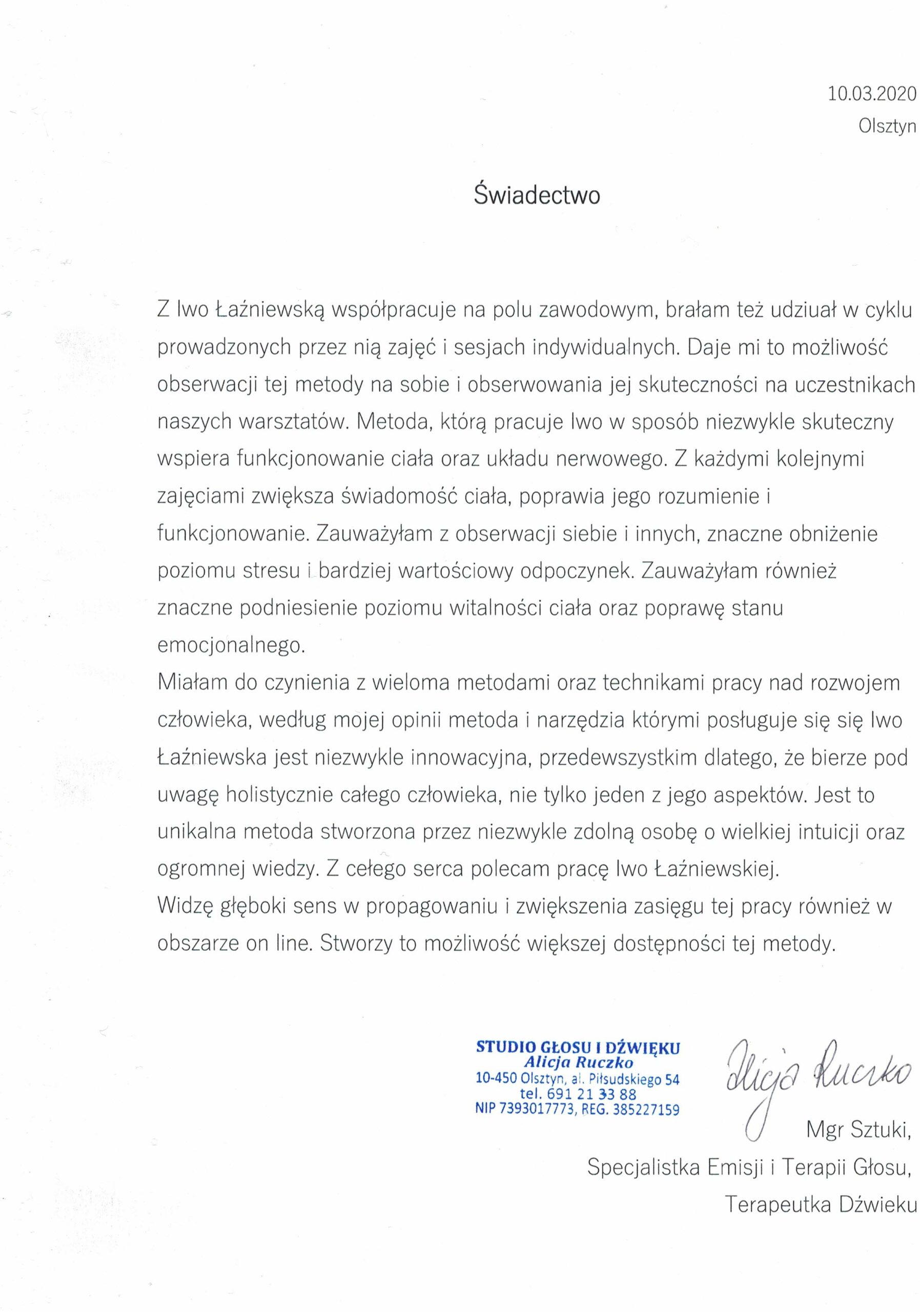 Dzięki Iwo znalazłam się w środku siebie. I już siebie tulę. I już siebie nie opuszczę. Jestem dla siebie. Odkryłam nowe przestrzenie. Rozpoznałam siebie. Odnalazłam skarb. Źródło życia. Idę do niego w sobie. Woła mnie. Obudziła to bardzo piękna i precyzyjna praca z delikatnego miejsca, gdzie Iwo widzi i czuje ciało-psychiko-duszę jako jedno. Jesteśmy całością. Tak. Jestem cała. I teraz wiem dlaczego ocalałam. W imię miłości i życia.
